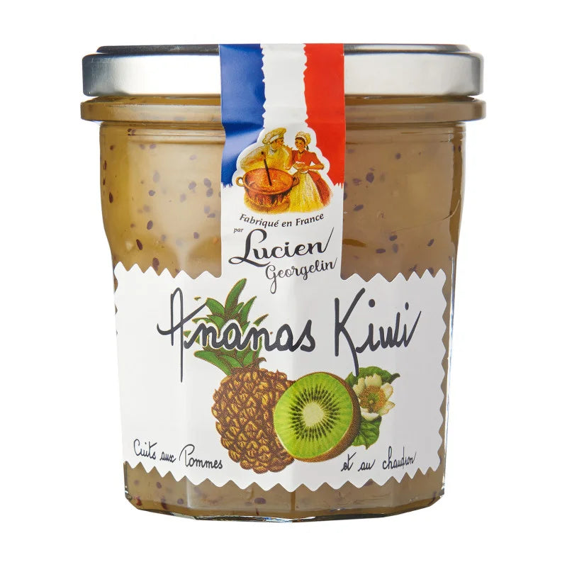 Ananas 45 %, kiwis 10 %, sucre, jus de fruits concentrés (pomme, raisin, citron), gélifiant : pectine de fruits.