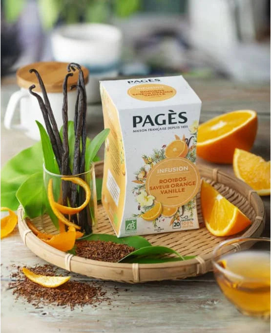 Dégustez le Rooibos BIO Orange - Vanille de Pagès, une infusion douce et naturellement sans théine. Le rooibos d'Afrique du Sud se marie ici aux notes chaleureuses de vanille et aux accents fruités de l’orange pour une tasse gourmande, idéale à savourer à tout moment de la journée.